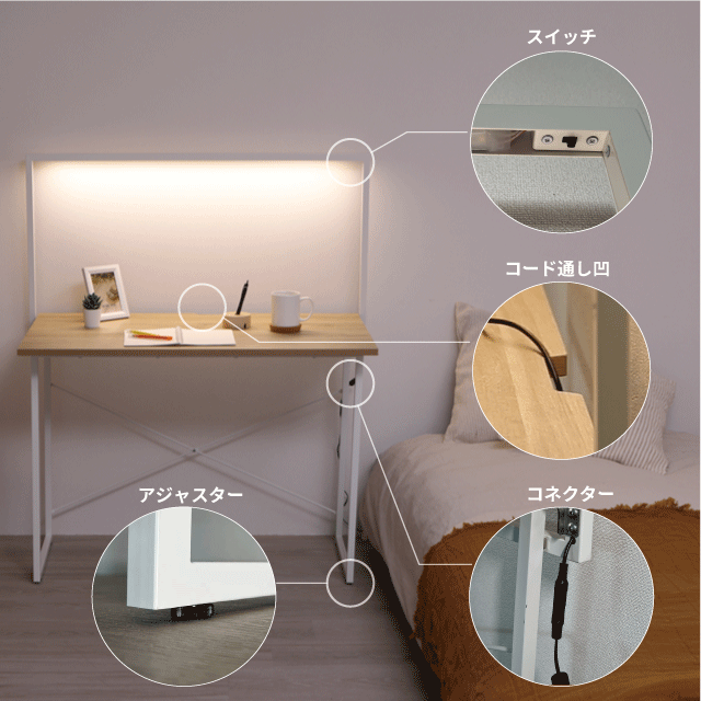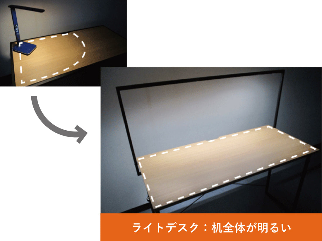 フレームの端から端までLEDを内蔵することにより、照明スタンドだけではカバーしきれない机の隅々まで明るく照らします。また、壁際にデスクを配置すれば、壁からの反射にあってより机上面を明るく照らします。