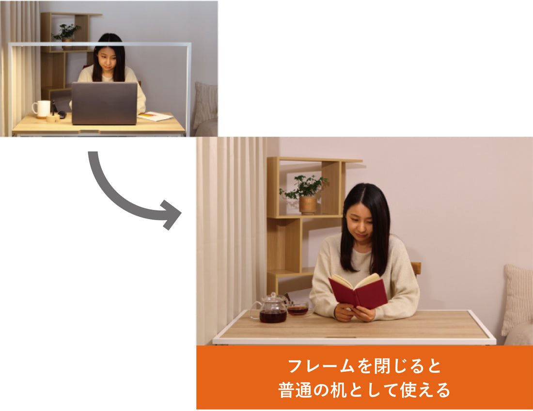 フレームを閉じると、一人用の食卓や作業スペースとしても利用可能