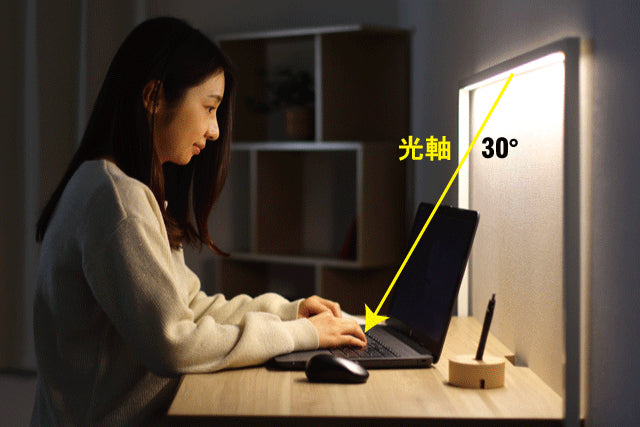 LED照明の角度を直下ではなく、30度手前に向けて内蔵しているので机の手前まで光を行き届かせています。直接目に光源に入らないことと、机の隅まで光を届けることを両立させるよう、内蔵LEDの角度にこだわりました。