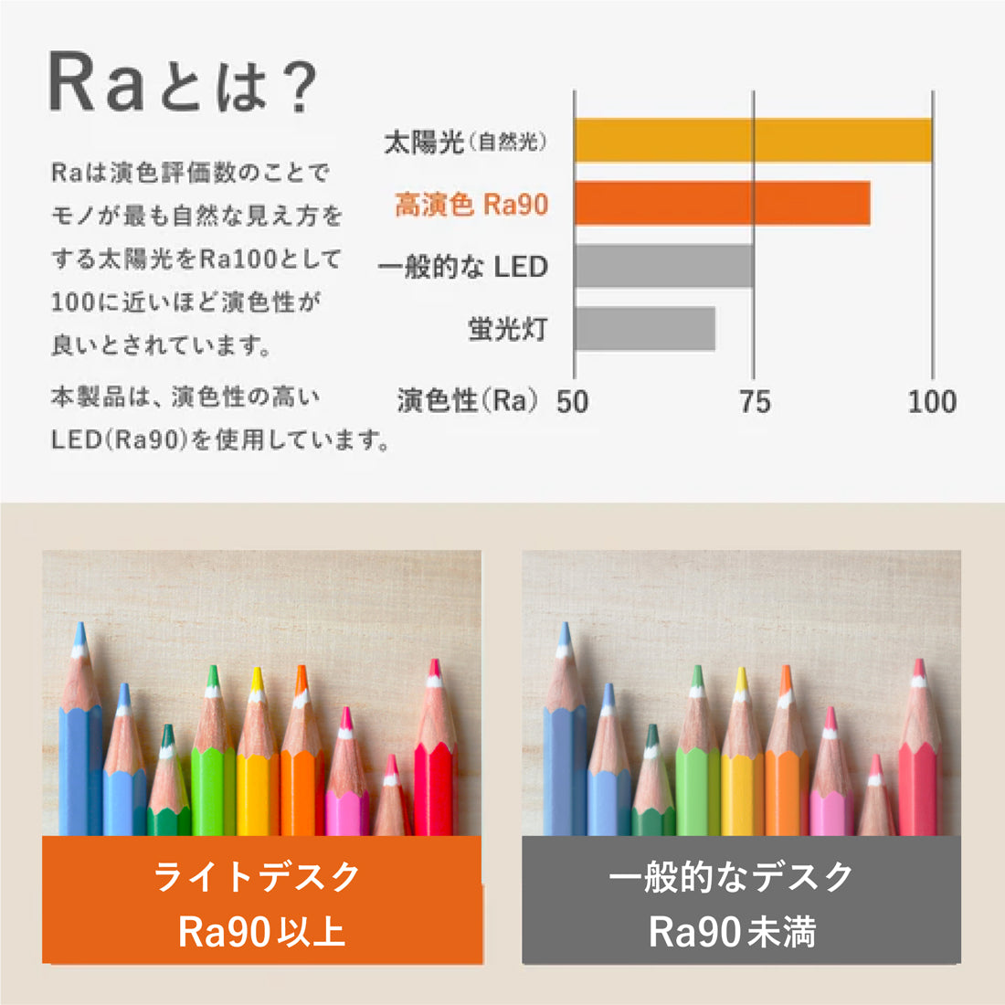 演色性とは、照明により物の見え方のことをいいます。太陽光はRa100と定められ、この数値に近いほど自然の色味で物を見ることができます。このライトデスクは、Ra90以上でデザイナーやアパレル関係などの色を使うお仕事にぴったりな高演色なライトです。※Raとは色合いを表す演色性の数値のことです。