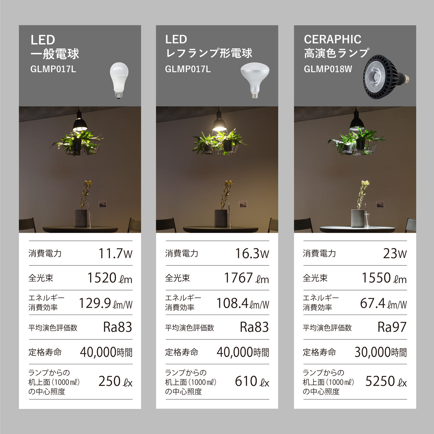 設置する空間に合わせて3種類のランプバリエーションから選べます。植物育成用の高演色ランプ(GLMP018W)を選べば、自然光に近しい光で植物とテーブル上を鮮やかに照らします。